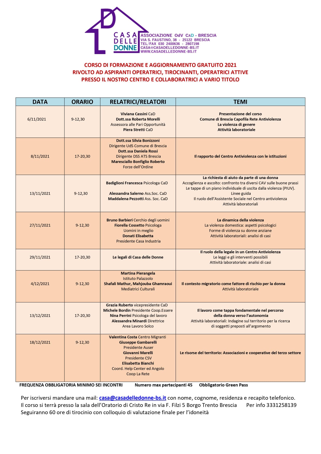 Sabato 6 Novembre 2021 si terrà la serata di Presentazione del Corso di formazione e aggiornamento organizzato dall’Associazione Casa delle Donne CaD di Brescia rivolto ad aspiranti operatrici, tirocinanti, operatrici attive presso il nostro centro e collaboratrici a vario titolo; a seguito del Corso teorico sono previste 60 ore di tirocinio con colloquio di valutazione finale per l’idoneità.