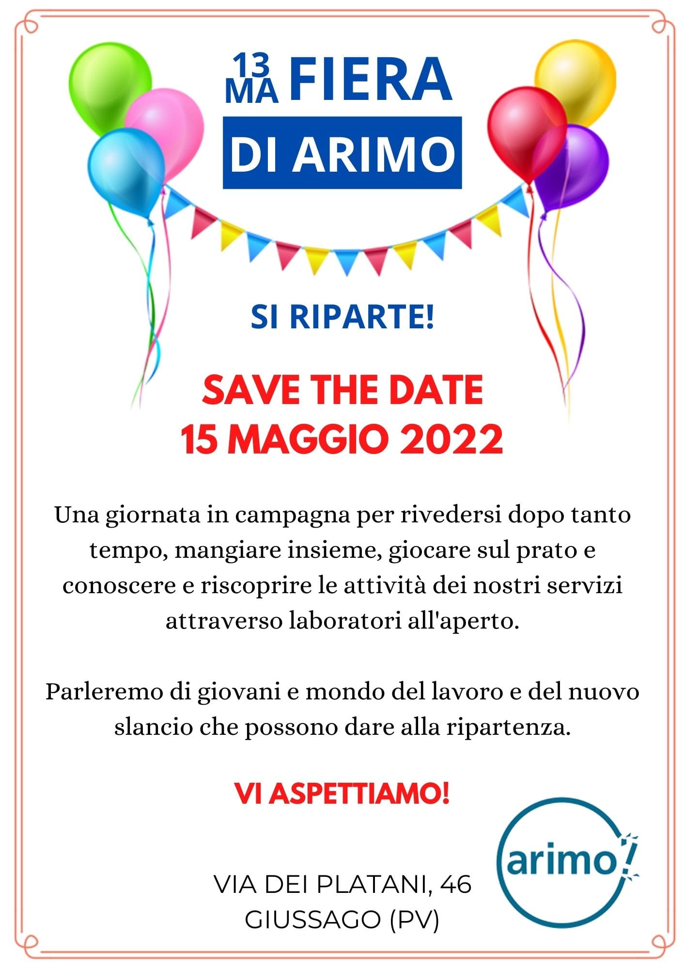 Domenica 15 maggio 2022, presso la sede “Casa di Camillo” di Giussago (via dei Platani 46, Giussago, Pavia), si terrà la 13° Fiera di Arimo, un evento di rilancio delle attività dei servizi di Arimo Cooperativa Sociale, con dialoghi sui giovani e il mondo del lavoro.