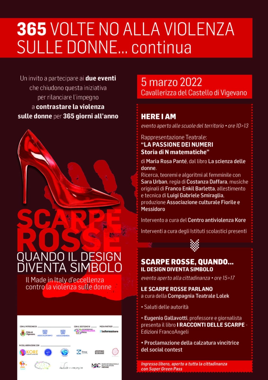 Kore Centro Antiviolenza di Vigevano e Lomellina insieme ad altre realtà associative presenti sul territorio, Lo Specchio Dei Sogni e il Coordinamento Volontariato Vigevano, con il sostegno della Rete Interistituzionale Antiviolenza di Pavia e con il patrocinio del Comune di Vigevano, Assolombarda e Assocalzaturifici propongono due eventi a chiusura dell’iniziativa partita il 20 novembre 2021.