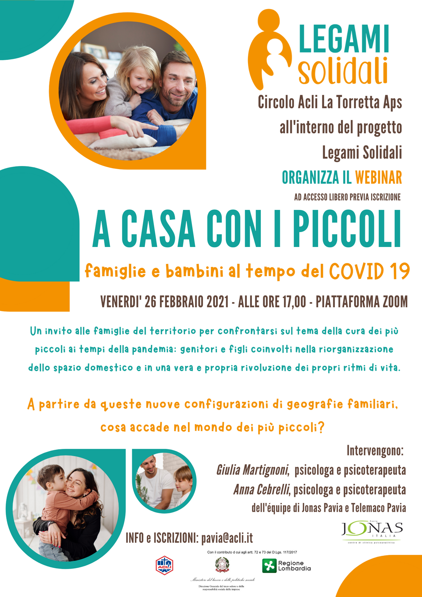 ll Circolo ACLI La Torretta APS organizza il 26 febbraio alle ore 17 il seminario online “A casa con i piccoli: famiglie e bambini al tempo del Covid 19”.