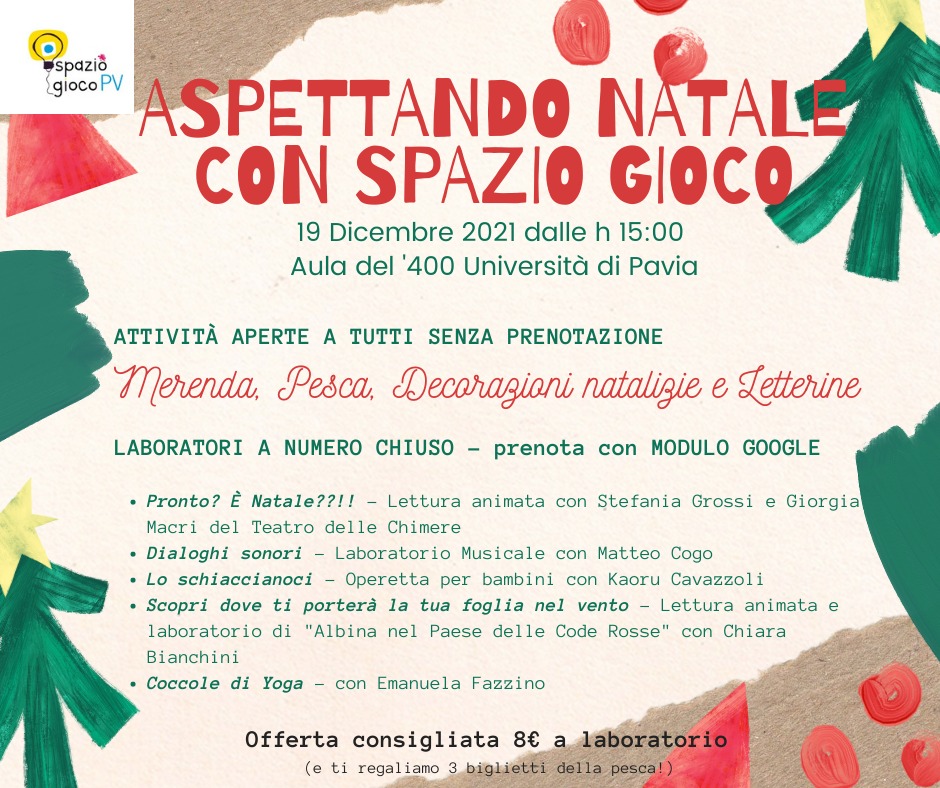 Domenica 19 dicembre dalle 15:00, presso l’Aula del ‘400 dell’Università di Pavia, potete partecipare a 5 laboratori: LETTURE ANIMATE, MUSICA, OPERETTA E YOGA.