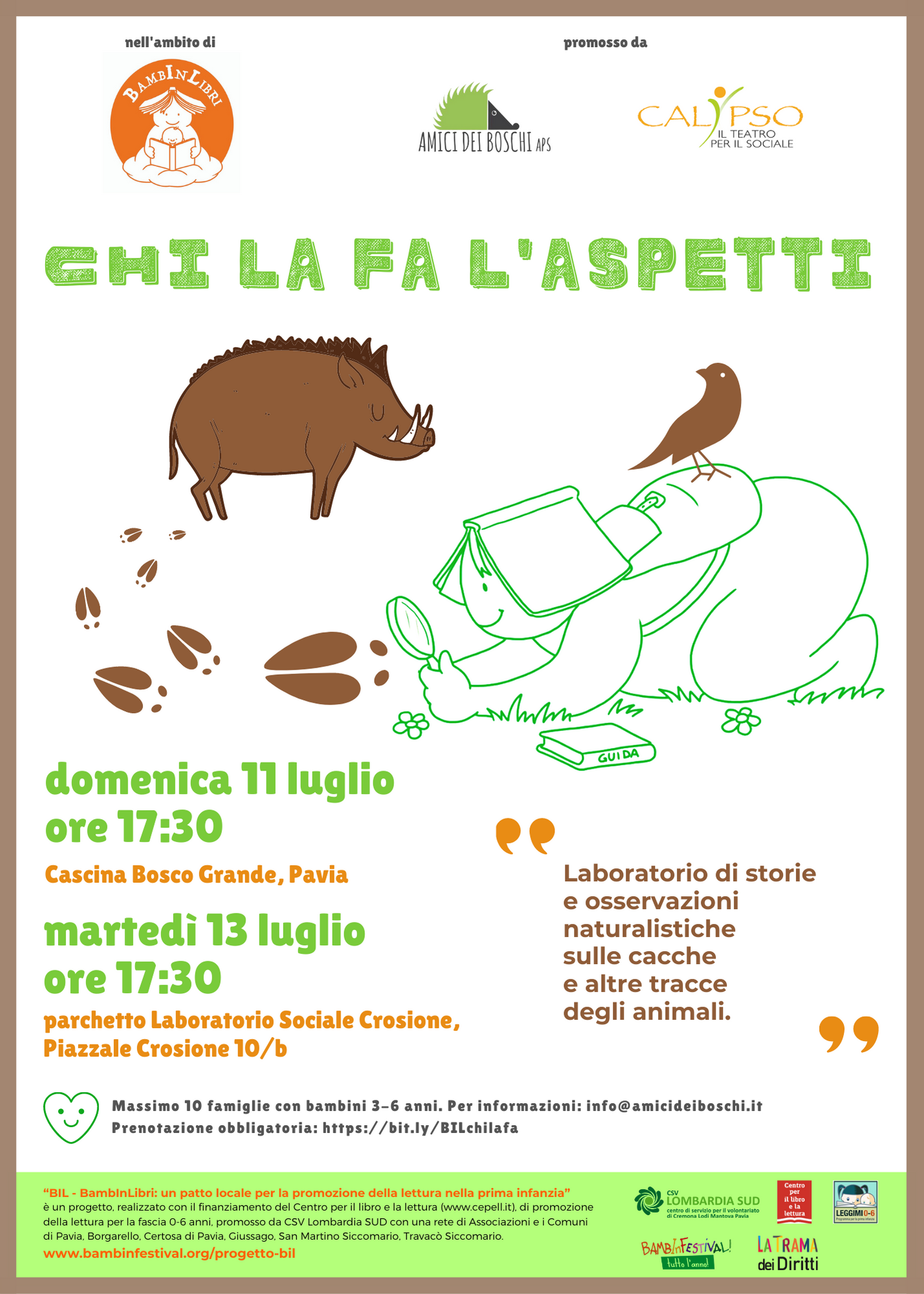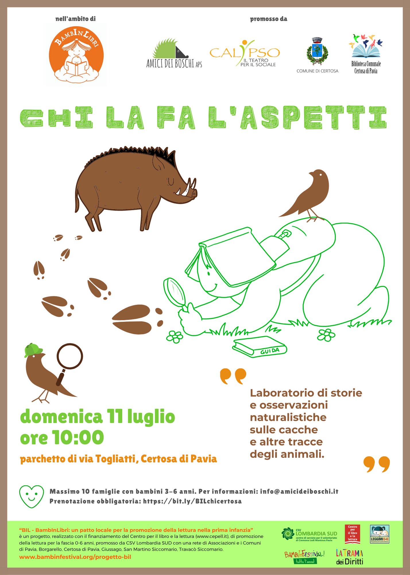 L’associazione Amici dei Boschi, in collaborazione con Calypso, propone tre momenti di narrazione ed esplorazioni in natura, con Chi la fa l’aspetti! laboratorio naturalistico sul tema delle cacche e delle tracce animali.