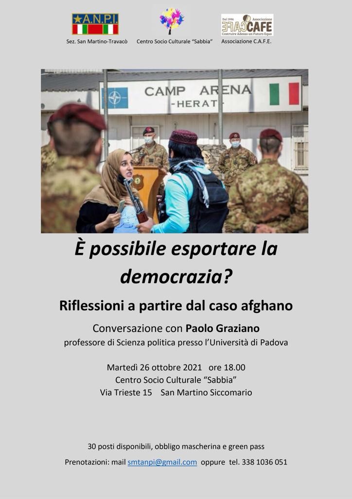 Martedì 26 ottobre 2021 alle ore 18 si terrà la conferenza “È possibile esportare la democrazia?” presso il Centro Socio Culturale “Sabbia” (via Trieste 15, San Martino Siccomario, Pavia).