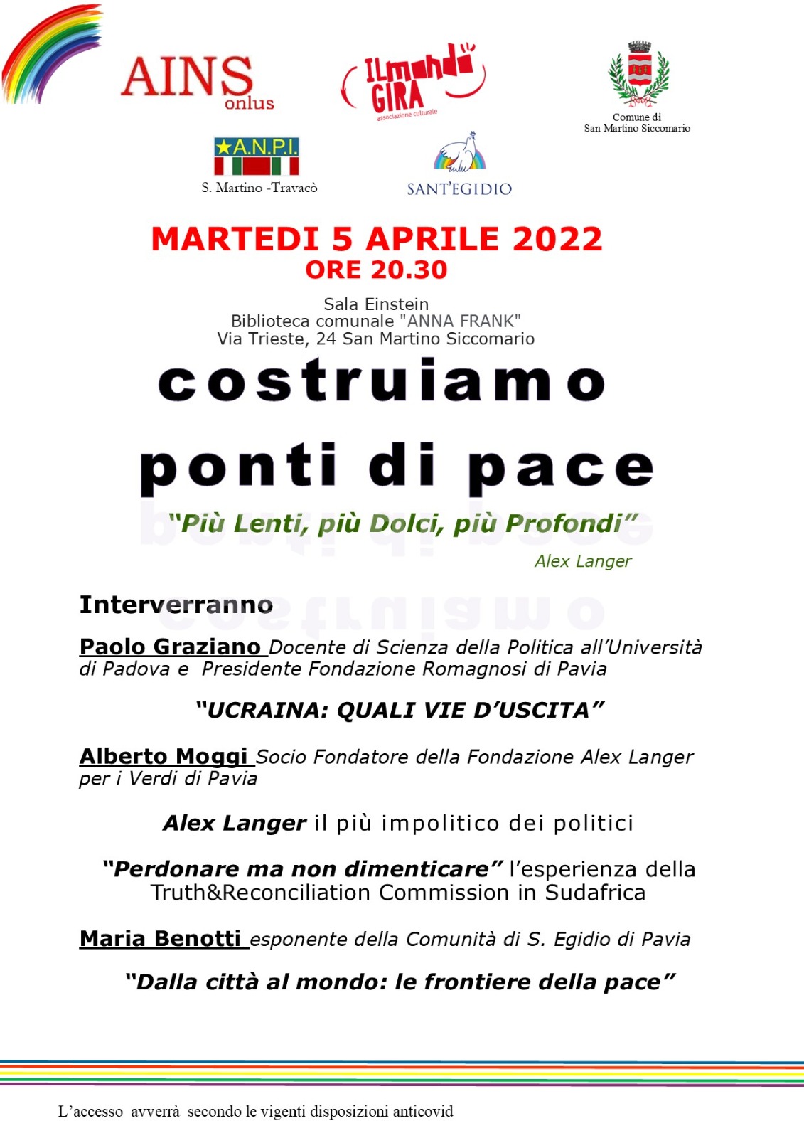 Martedì 5 aprile 2022, alle ore 20:30, presso la Sala Einstein della Biblioteca Comunale “Anna Frank” (via Trieste 24, San Martino Siccomario”), si terrà l’iniziativa “Costruiamo ponti di pace“.
