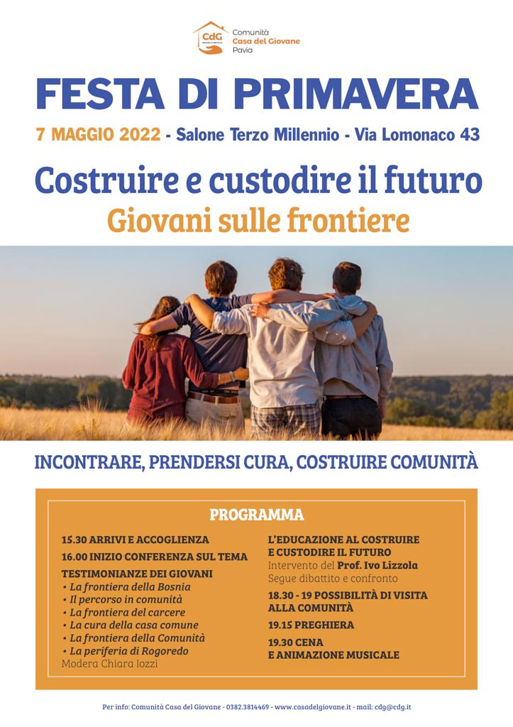 Sabato 7 maggio 2022, presso il Salone Terzo Millennio (via Lomonaco 43, Pavia), dalle 16:00 alle 19:30, si terrà l’incontro “Costruire e custodire il futuro: Giovani sulle frontiere“, a cura della Comunità Casa del Giovane di Pavia.