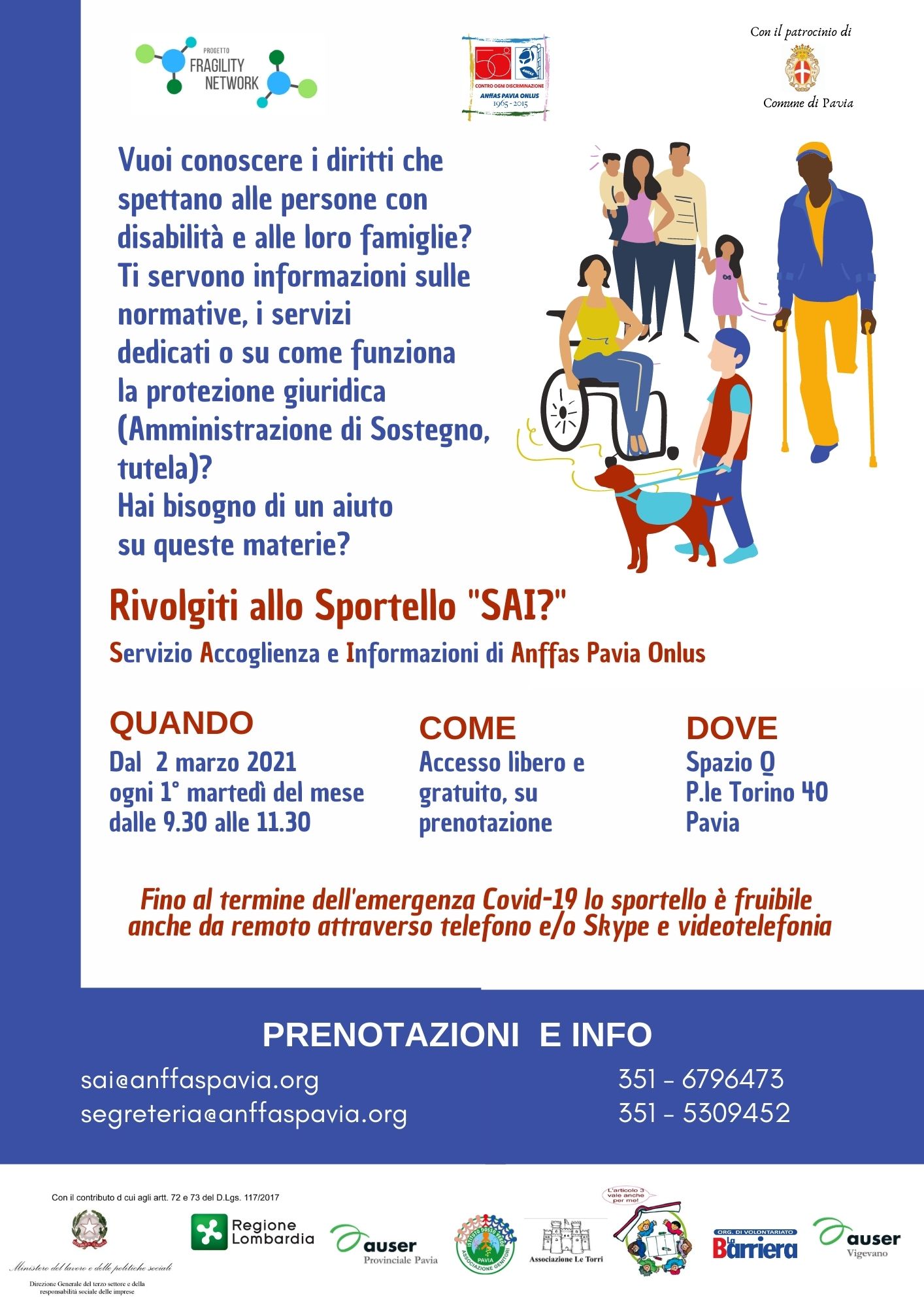 Lo sportello è un’iniziativa di ANFFAS Pavia nell’ambito del progetto FRAGILITY NETWORK, finanziato dal Ministero del Lavoro e delle Politiche Sociali e da Regione Lombardia, con capofila Auser Comprensoriale di Pavia.