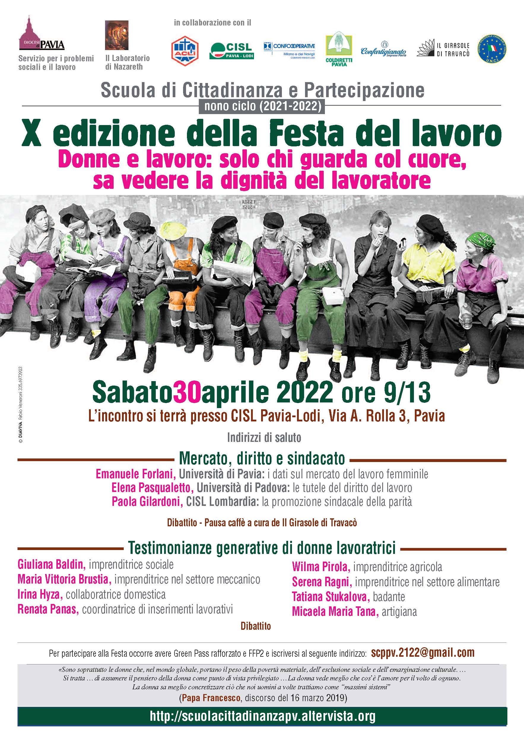 Il prossimo evento della Scuola di Cittadinanza e Partecipazione, conclusivo del nono ciclo 2021/2022, si terrà sabato 30 aprile dalle 9 alle 13 con un incontro sul tema Donne e lavoro: solo chi guarda col cuore, sa vedere la dignità del lavoratore presso la sede di CISL Pavia-Lodi, in Via A. Rolla 3, a Pavia. Il manifesto qui (127 download ) .