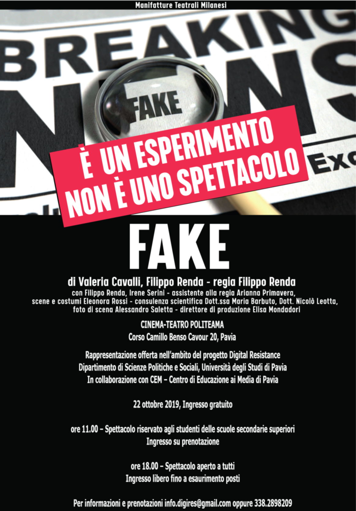 FAKE: spettacolo teatrale offerto nell’ambito del progetto Digital Resistance Dipartimento di Scienze Politiche e Sociali, Università degli Studi di Pavia in collaborazione con CEM – Centro di Educazione ai Media di Pavia
