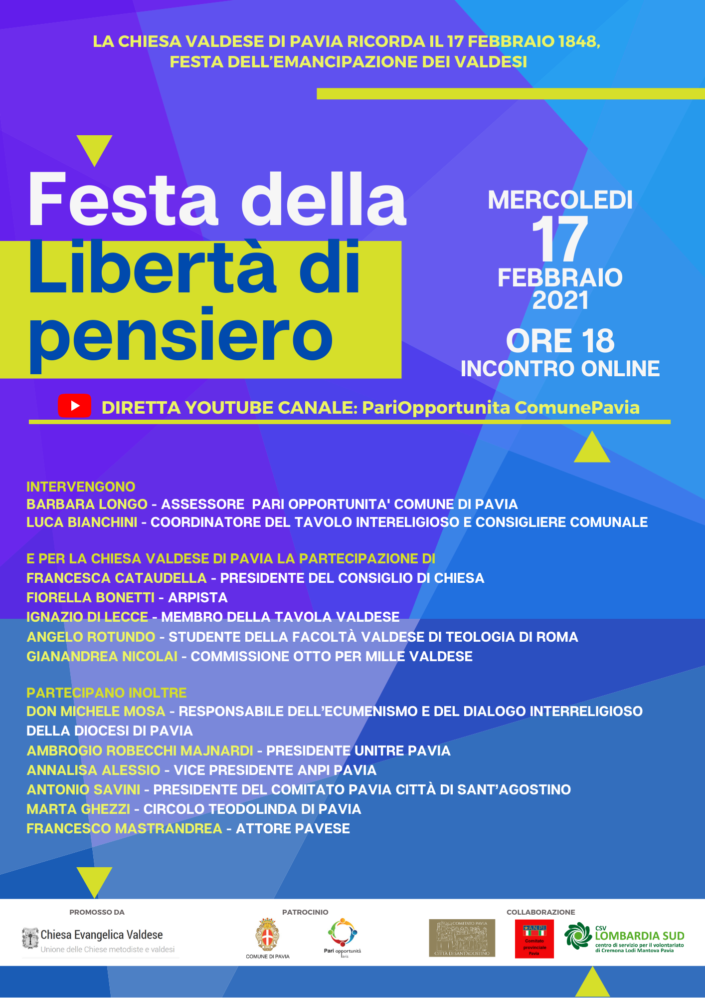 La Chiesa Valdese di Pavia ricorda il 17 febbraio 1848, festa dell’emancipazione dei valdesi.