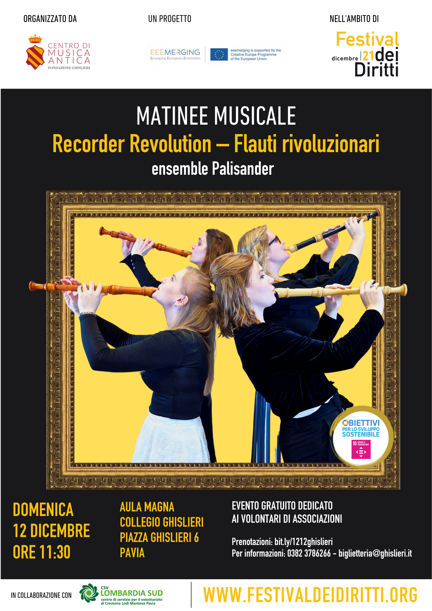 L’ensemble Palisander presenta “Recorder Revolution – Flauti rivoluzionari” il 12 dicembre alle 11:30, nel giorno di chiusura del Festival di Diritti 2021. All’evento sono invitati associazioni, volontari e destinatari dei loro servizi.