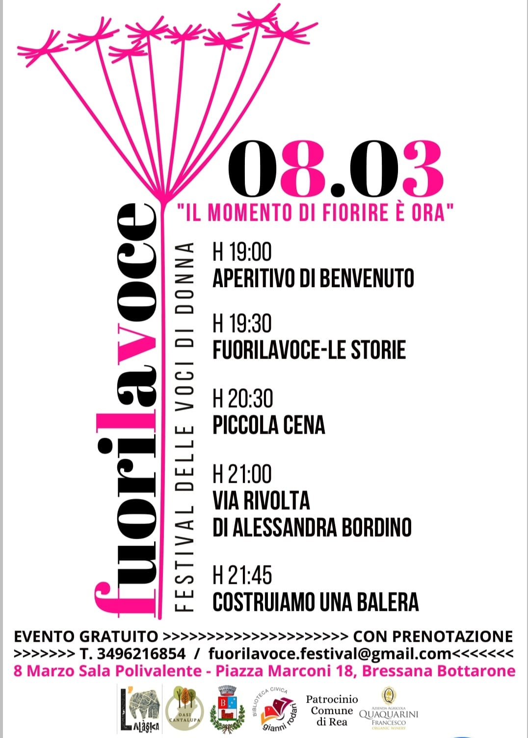 Marcoledì 8 marzo dalle 19, nella sala Polivalente del Comune di Bressana Bottarone avrà luogo l’evento che apre il Festival “FuoriLaVoce” con una serata ricca di appuntamenti e performance che vedrà le 8 donne protagoniste raccontare le loro storie con le parole, il canto, la musica e la danza.