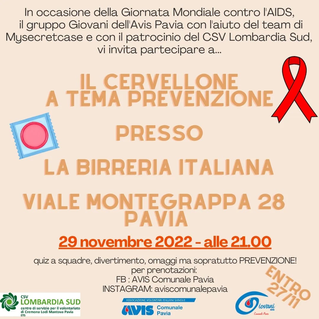 Il 29 novembre, in vista della Giornata Mondiale contro l’AIDS, il Gruppo Giovani di AVIS Comunale di Pavia organizza il quiz a squadre che si terrà alla Birreria Italiana in viale Montegrappa 28 a Pavia.