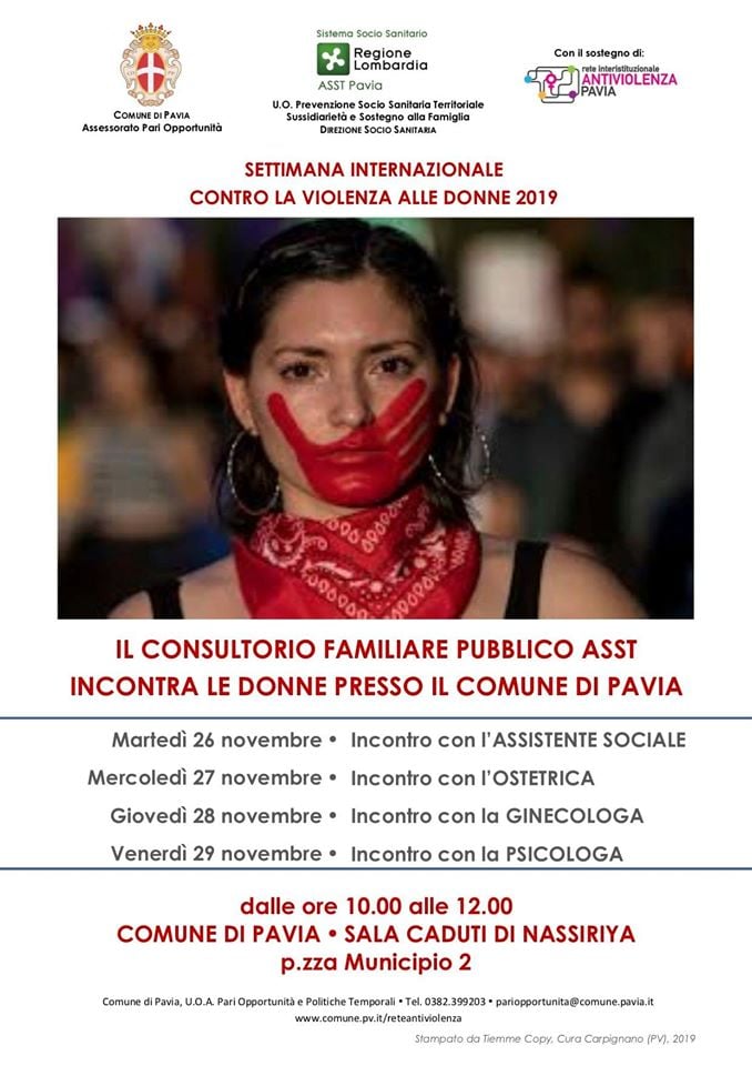 - Il Consultorio Familiare Pubblico Asst Pavia dal 26 novembre incontra le donne presso il Comune di Pavia, Palazzo Mezzabarba, Sala Caduti di Nassiriya, dalle ore 10 alle ore 12. Il programma (299 download ) ;