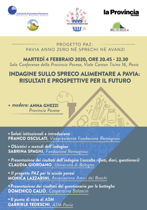 La Fondazione Romagnosi, in collaborazione con l’Associazione Amici dei Boschi, la Cooperativa sociale Balancin, ASM Pavia e la Provincia Pavese, organizza martedì 4 febbraio 2020 alle ore 20.45 presso la Sala Conferenze della Provincia Pavese (Viale Canton Ticino 16, Pavia) un evento di presentazione dei risultati dell’indagine sullo spreco alimentare realizzata a Pavia nei mesi di ottobre-novembre-dicembre 2019 nell’ambito del progetto “PAZ. Pavia Anno Zero: Nè Sprechi Nè Avanzi”.