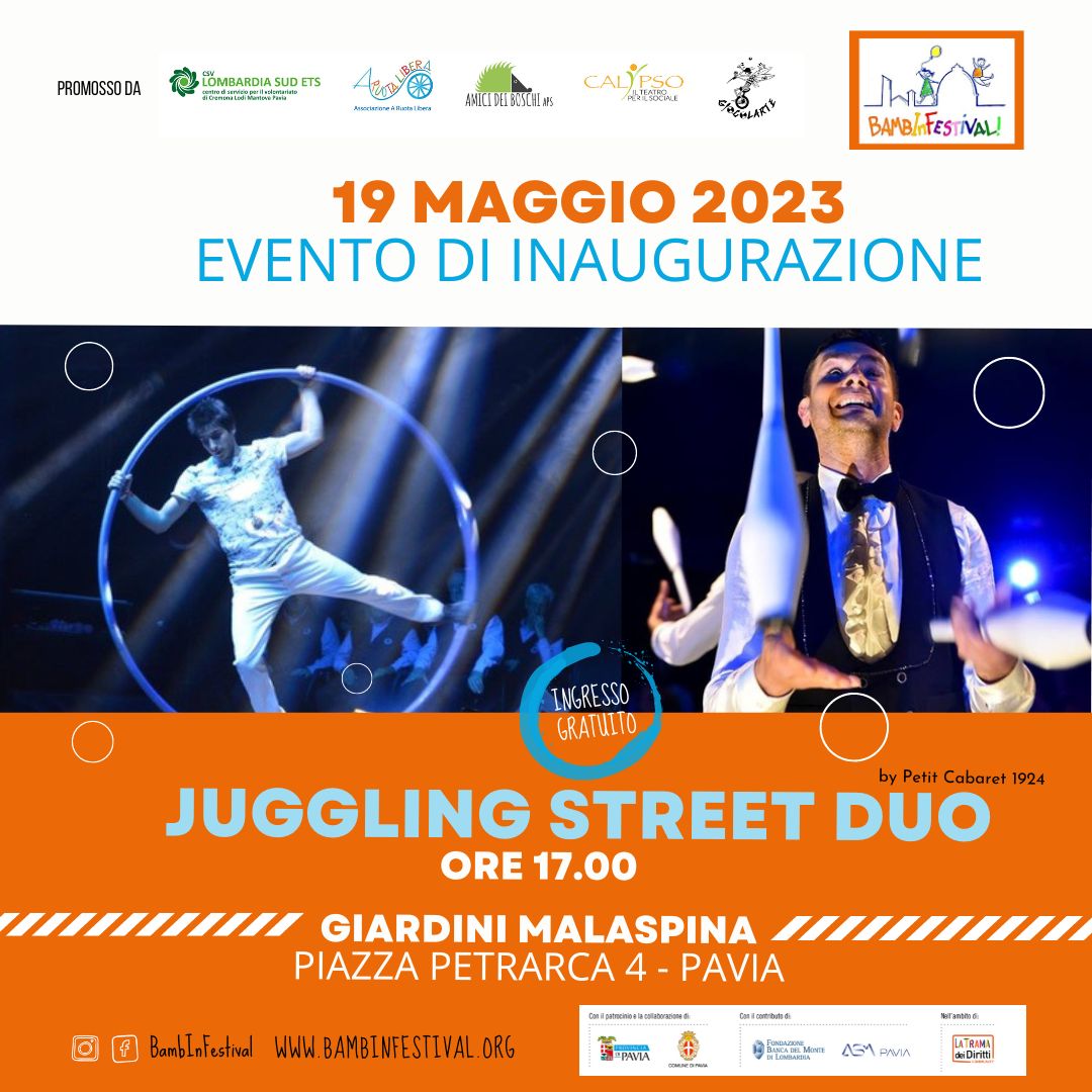 BambInFestival prenderà avvio venerdì 19 maggio alle ore 17.00 presso IL CINEMA POLITEAMA CORSO CAVOUR 20 A PAVIA Giardini Malaspina in piazza Petrarca a Pavia con lo spettacolo gratuito Juggling Street Duo, un’appassionante performance di teatro di strada, con giocoleria, ruota di cyr e monociclo, produzione Petit Cabaret 1924.