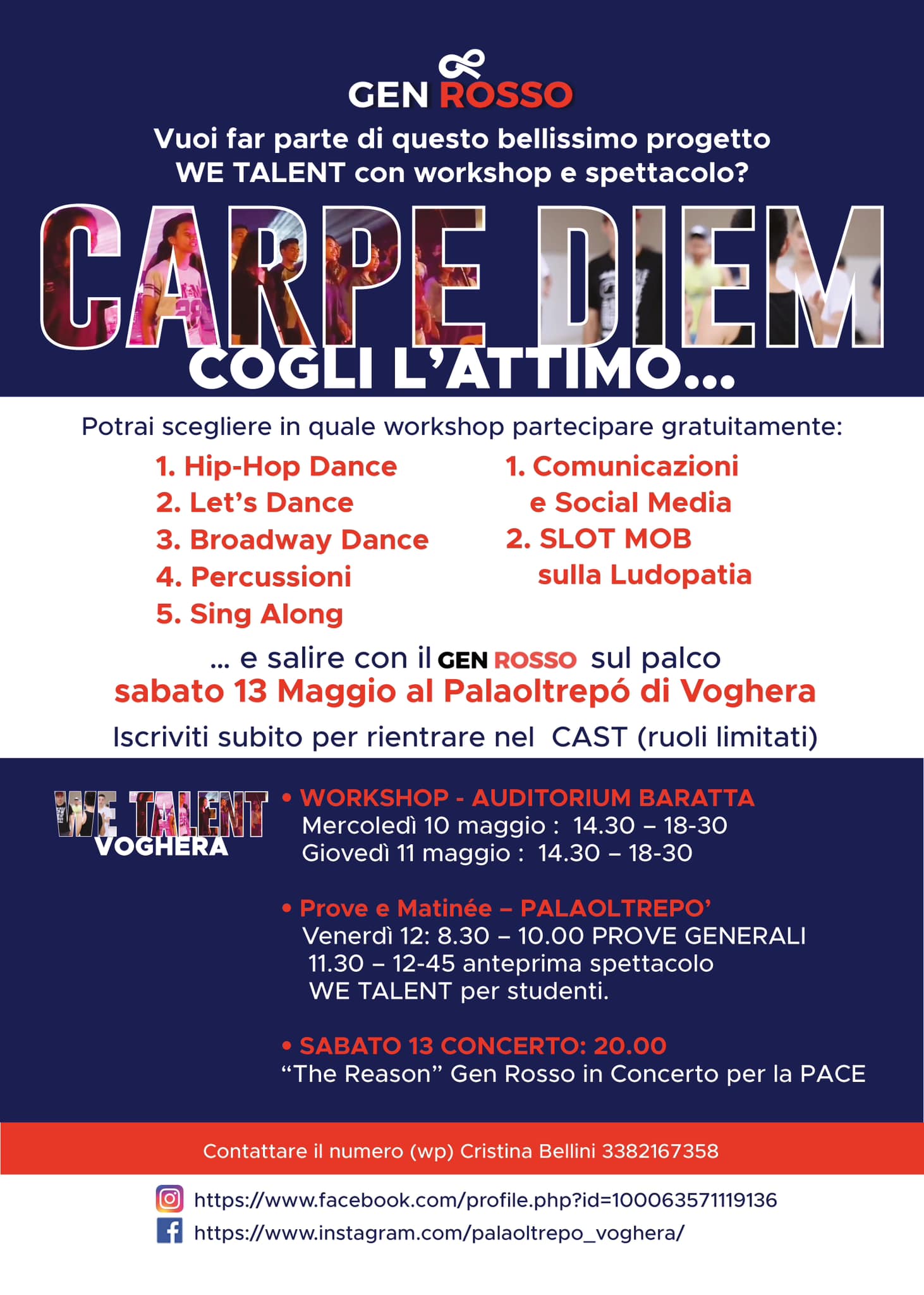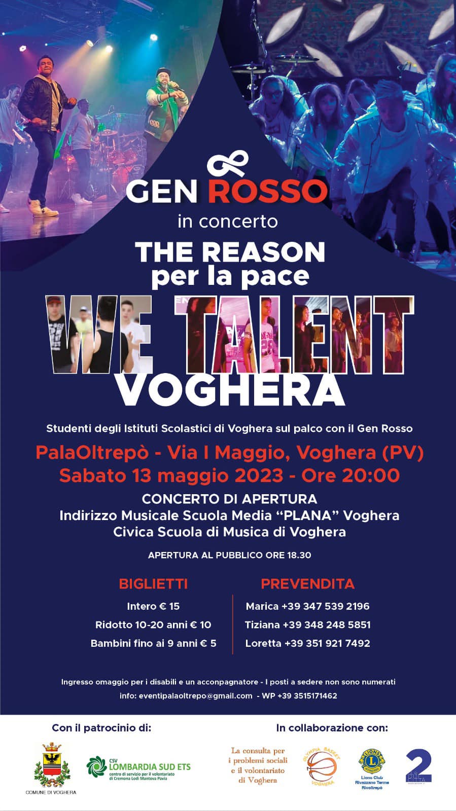 Il progetto WE TALENT è proposto da Gen Rosso International Performing Arts Group con il patrocinio del Comune di Voghera Assessorato alle Politiche Sociali, la Consulta del Volontariato di Voghera , CSV Lombardia Sud ETS, Olympia Basket Voghera, Associazione Famiglie Nuove Voghera, Lions Club Rivanazzano Terme , l’Ass. del terzo settore per la promozione sociale “Le 2 Città “ di Milano e gli istituti scolastici della città di Voghera.