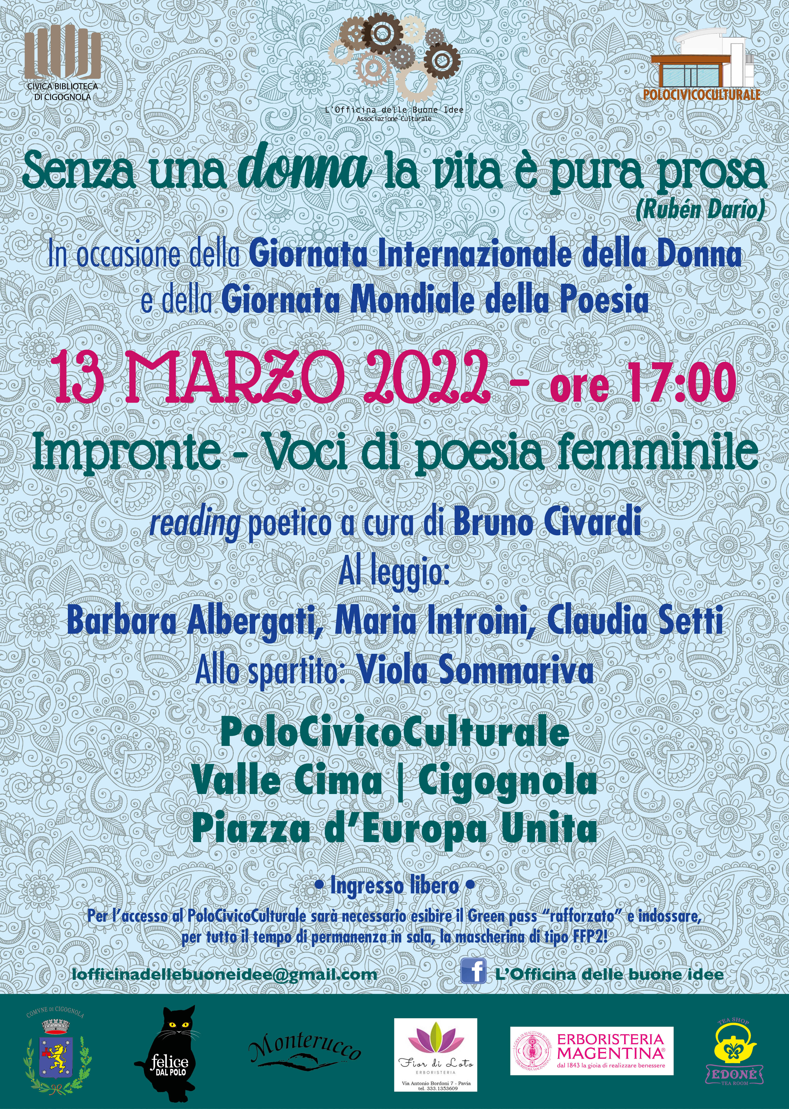 Il secondo appuntamento nel calendario di eventi organizzati da L’Officina delle Buone Idee per celebrare con iniziative trasversali la Giornata Internazionale della Donna e la Giornata Mondiale della Poesia si terrà domenica prossima, 13 marzo 2022 (inizio ore 17:00) – PoloCivicoCulturale di Valle Cima – Cigognola