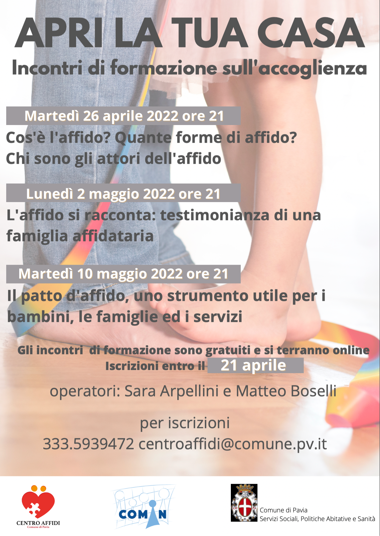 Nel mese di aprile e maggio si terranno tre incontri di formazione sull’accoglienza organizzati dal Centro Affidi del Comune di Pavia e la cooperativa COMIN, tenuti dagli operatori Sara Arpellini e Matteo Boselli.