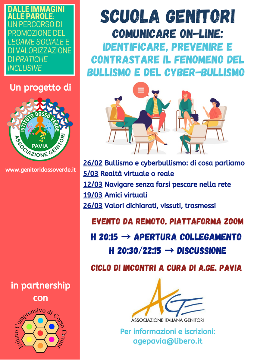 È in partenza l’azione di progetto relativa alla SCUOLA GENITORI condotta da A.Ge Pavia: una occasione per i genitori e le famiglie per condividere e discutere buone prassi educative rispetto al rapporto fra giovanissimi e web per individuare, prevenire e contrastare il bullismo e il cyber bullismo. Il percorso è gratuito e si svolge da remoto tramite la piattaforma ZOOM.