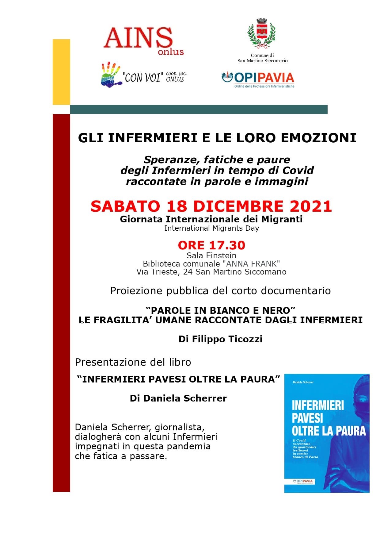 Sabato 18 dicembre 2021, in occasione della Giornata Internazionale dei Migranti, alle ore 17:30, si terrà presso la Sala Einstein della Biblioteca comunale “Anna Frank” di San Martino Siccomario in via Trieste n. 24, l’incontro “Gli infermieri e le loro emozioni: Speranze, fatiche, e paure degli Infermieri in tempo di Covid raccontate in parole e immagini”.