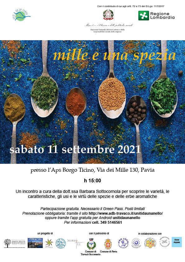 Sabato 11 settembre alle ore 15:00 presso la sede dell’APS Borgo Ticino (via dei Mille 130, Pavia) si terrà l’incontro “Mille e una spezia” a cura della dott.ssa Barbara Sottocornola per scoprire le varietà, gli usi e le virtù delle spezie e delle erbe aromatiche.