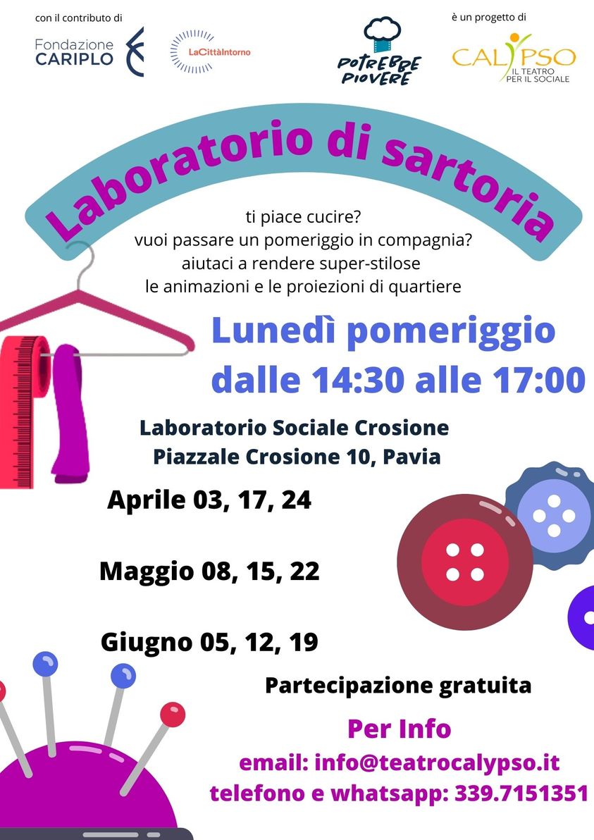 Il lunedì al Laboratorio Sociale Crosione inizia il Laboratorio di Sartoria dalle 14:30 alle 17:00 promosso da associazione Calypso – il teatro per il sociale.