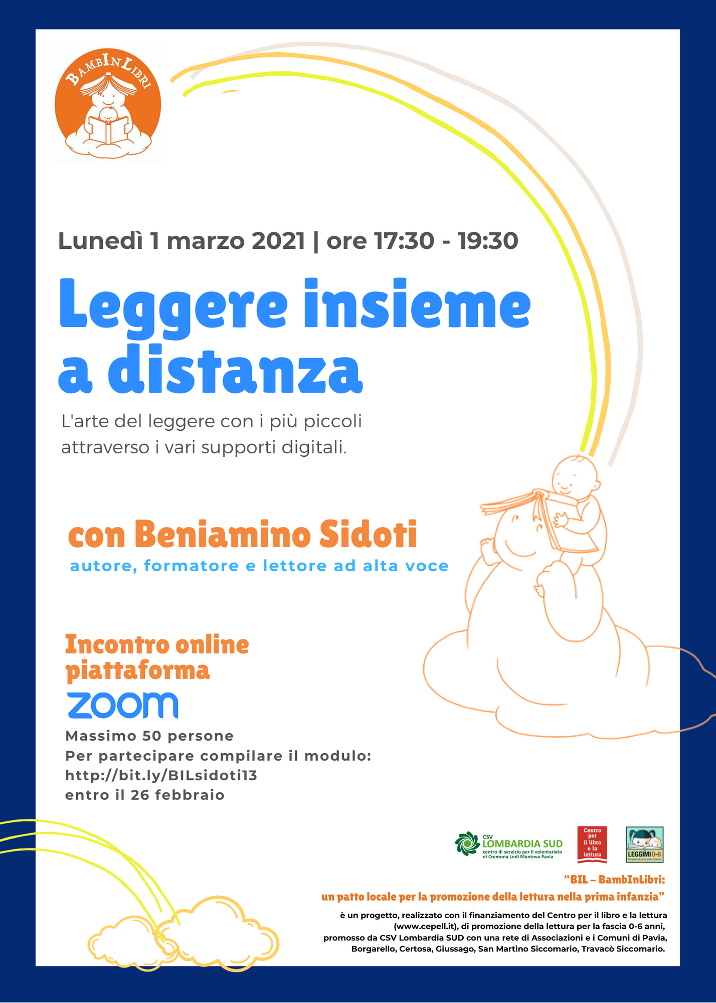 Leggere insieme a distanza. L’arte di leggere ai più piccoli attraverso i vari supporti digitali, questo il titolo del secondo incontro con Beniamino Sidoti che si svolge lunedì 1 marzo 2021, ore 17.30 su Zoom.