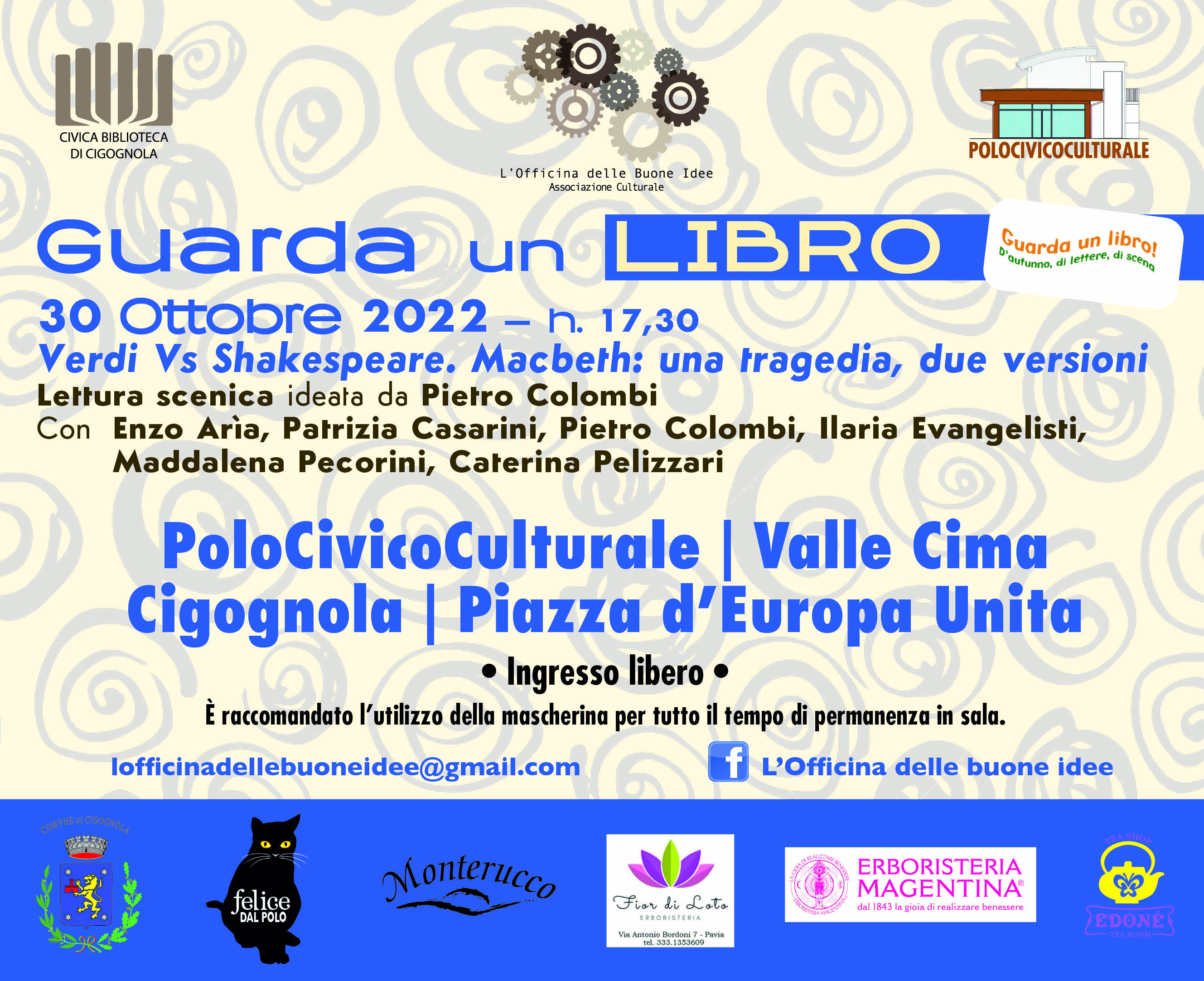 Organizzata dall’Associazione culturale L’Officina delle Buone Idee per domenica 30 ottobre 2022, ore 17,30, al PoloCivicoCulturale di ValleCima, Piazza d’Europa Unita, Cigognola, riproporrà la sanguinosa ascesa al trono scozzese di Macbeth secondo la visione dei due grandi autori e con un racconto che, alternando letture sceniche e filmati, cerca di evidenziare le principali differenze tra le due narrazioni.