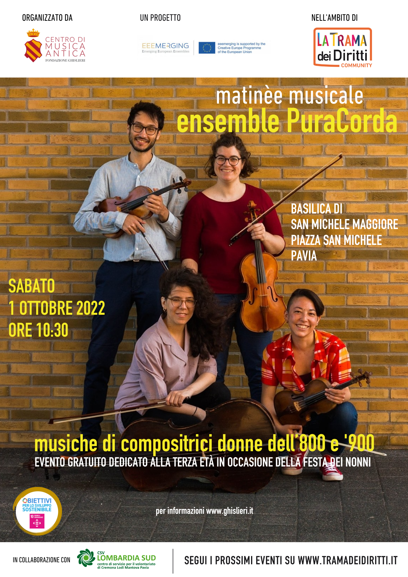 Sarà proposto un momento musicale dell’ensemble PuraCorda con musiche di compositrici donne dell’800 e ‘900. L’evento è realizzato nell’ambito di EEEMERGING+ un progetto su scala europea dedicato ai nuovi ensemble che operano nel campo della musica antica e nasce con lo scopo di promuovere e valorizzare i giovani talenti.