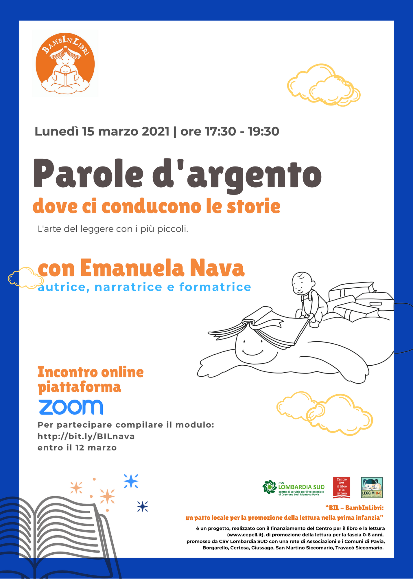 Nell’ambito del progetto che vuole promuovere interventi specifici di promozione della lettura a favore delle bambine e dei bambini da 0 a 6 anni, sono previsti dei momenti di formazione online dedicati agli adulti (genitori, educatori, insegnanti, bibliotecari, volontari) , gli appuntamenti sono gratuiti e aperti a tutti.