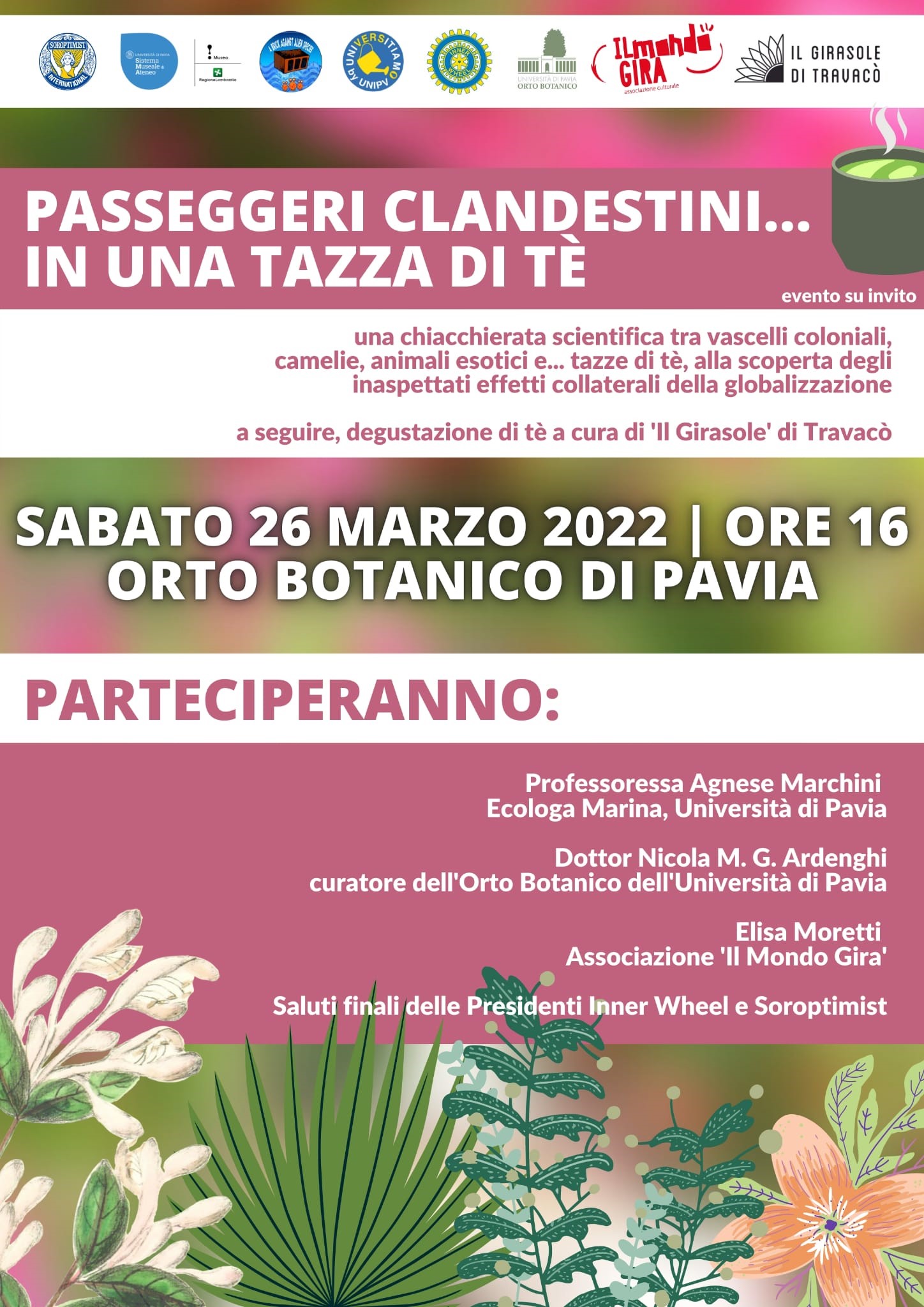 Sabato 26 marzo 2022, alle ore 16:00, si terrà presso l’Orto Botanico di Pavia (via Sant’Epifanio 14, Pavia) l’incontro “Passeggeri clandestini in una tazza di tè“, una chiaccherata sugli effetti collaterali della globalizzazione. Seguirà degustazione di tè a cura di “Il Girasole” di Travacò.