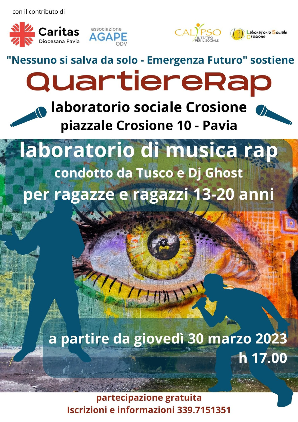 Nell’ambito del progetto “Nessuno si salva da solo – Emergenza Futuro”, le associazioni Calypso, Agape e Caritas di Pavia, danno vita al laboratorio “QuartiereRap”.