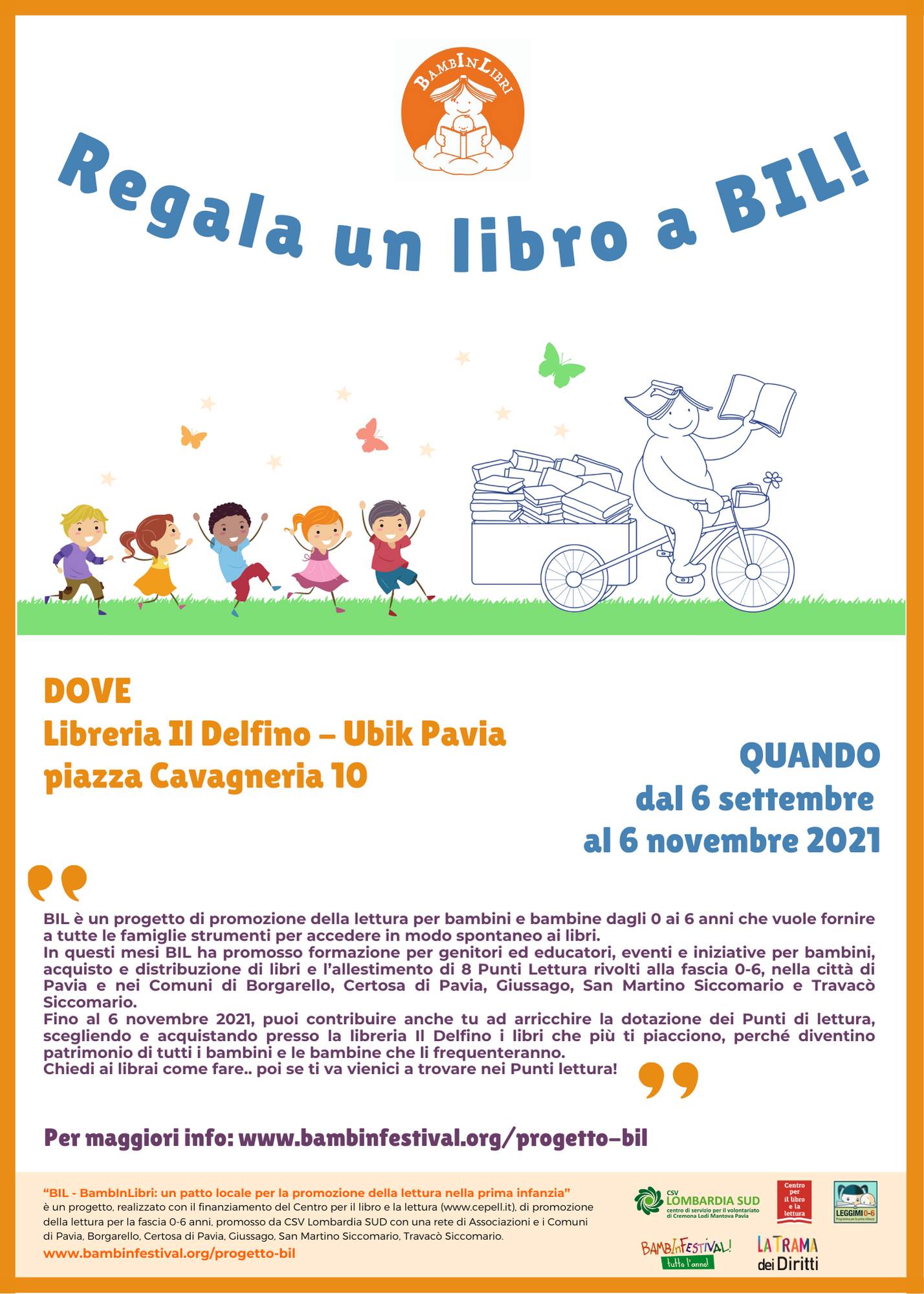 Dal 6 settembre fino al 6 novembre 2021 sarà possibile acquistare copie dei propri libri preferiti presso la libreria Il Delfino di Piazza Cavagneria 10 a Pavia, e lasciarle in dono ad uno (o più) degli 8 Punti Lettura BiL.