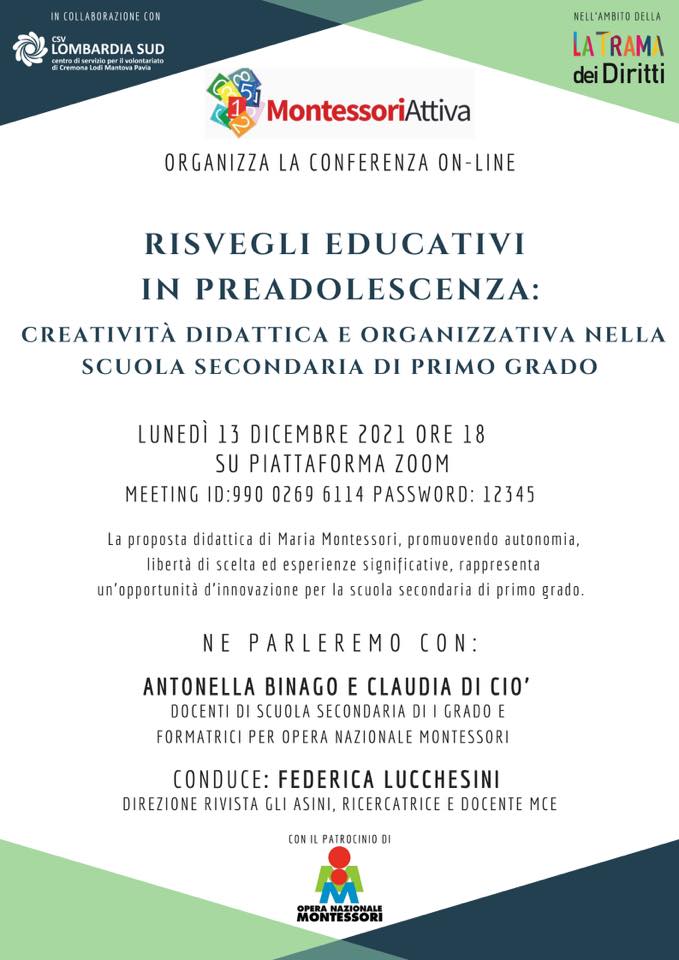 Il 13 dicembre ore 18 su ZOOM, l’associazione MontessoriAttiva – Pavia, con il patrocinio dell’Opera Nazionale Montessori – Italian Montessori Institution organizza la conferenza online “Risvegli educativi in preadolescenza: creatività didattica e organizzativa nella scuola secondaria di primo grado”.