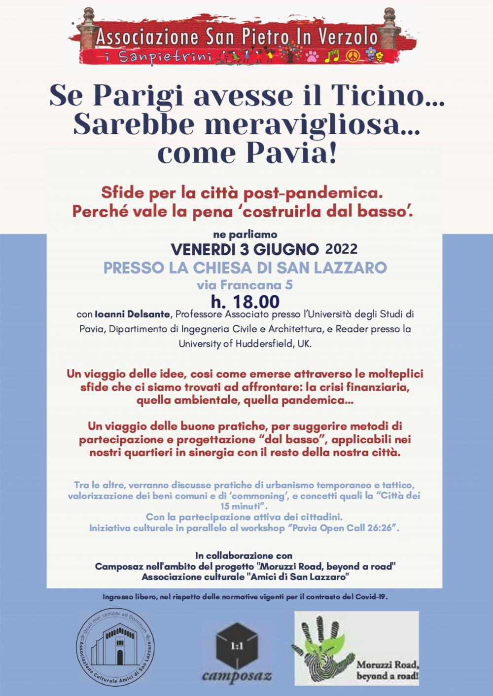 L’associazione San Pietro in Verzolo organizza per venerdì 3 giugno alle 18 presso la Chiesa di San Lazzaro in via Francana 5 a Pavia l’incontro sulle buone pratiche e sinergie che si possono attivare “dal basso” nei quartieri.