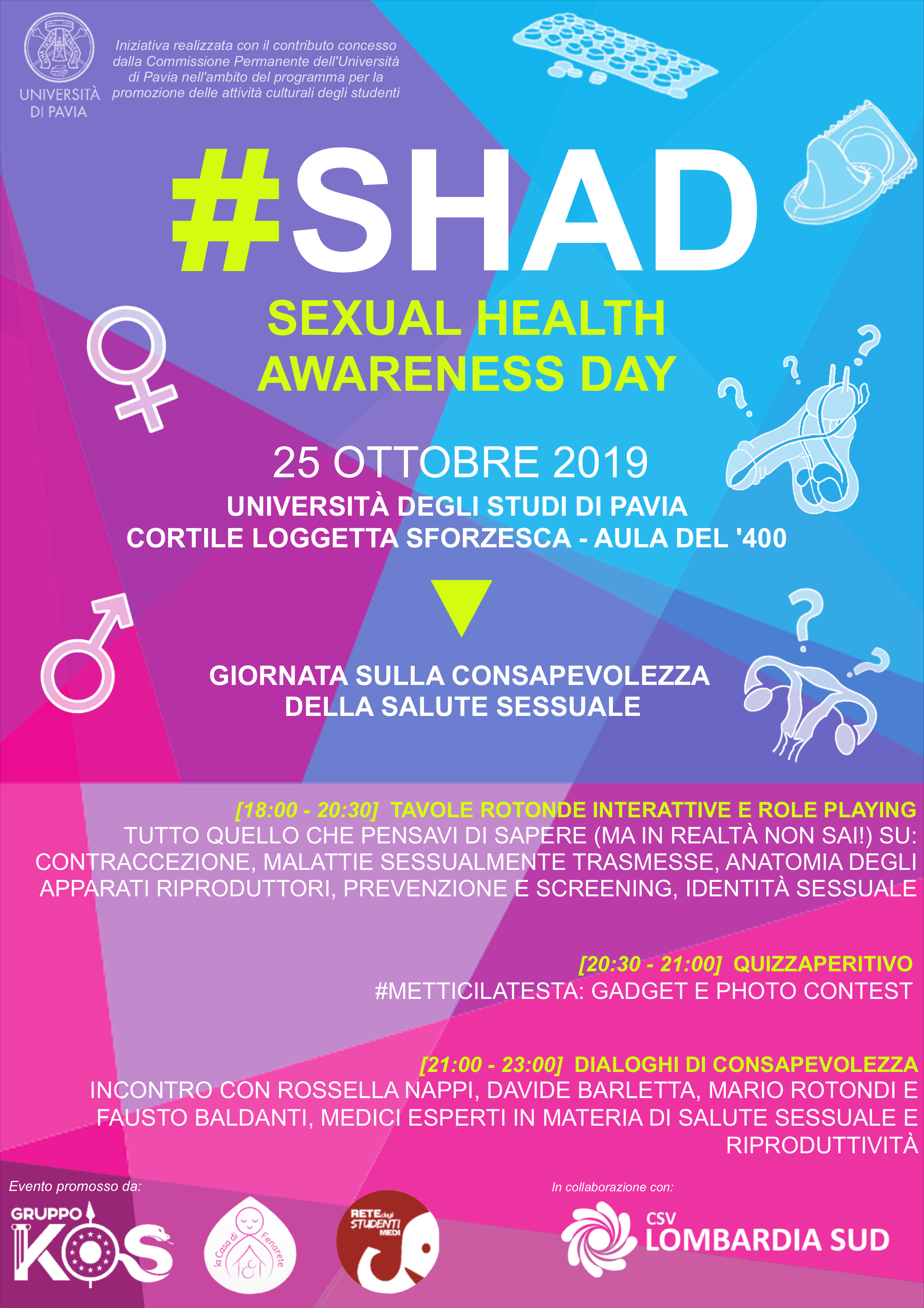 #SHAD: Sexual Health Awareness Day, il 25 ottobre il Gruppo Kos, in collaborazione con La Casa di Fenarete, la Rete degli Studenti Medi, e con il patrocinio di CSV Lombardia Sud vi offre una giornata interamente dedicata alla scoperta della salute e della (in)consapevolezza sessuale!