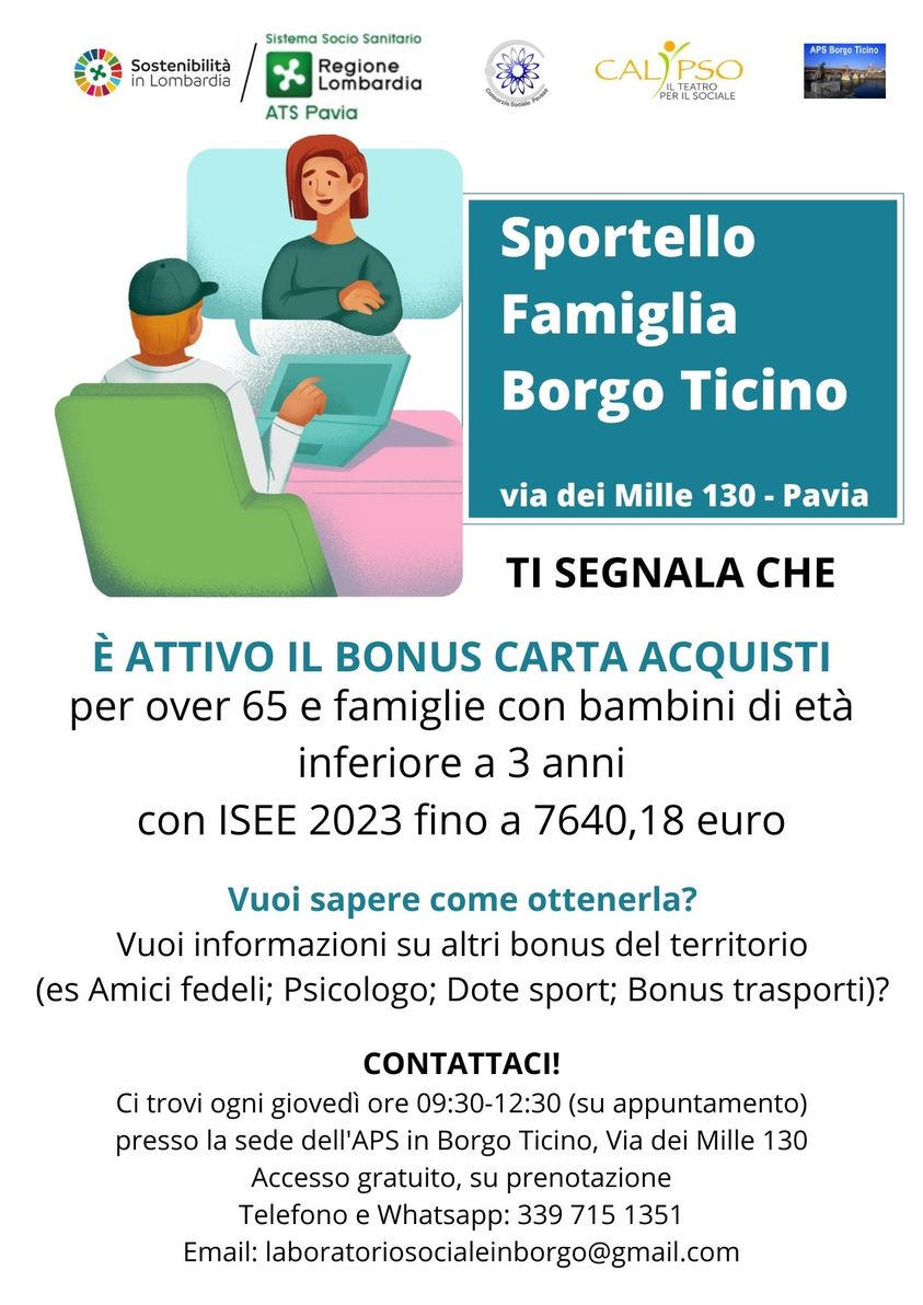Tutti i giovedì mattina dalle 9.30 alle 12.30 l’associazione gestisce lo Sportello Famiglia in Borgo Ticino in Via dei Mille 130 a Pavia grazie alla collaborazione con APS Borgo Ticino a cui tutti si possono rivolgere in caso di aiuto per disbrigare qualche pratica o conoscere i bonus attivi sul territorio.
