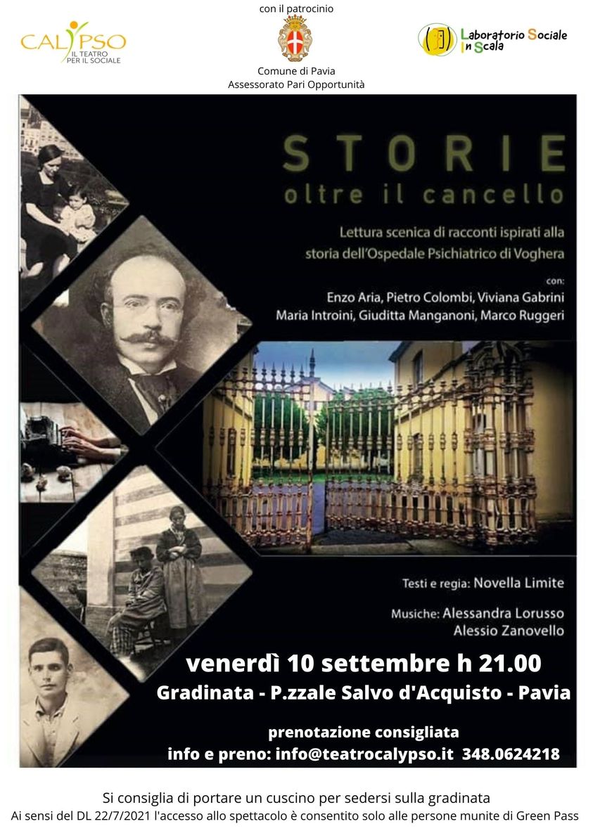 Venerdì 10 settembre 2021 alle ore 21 l’associazione Calypso il teatro per il sociale, ospita lo spettacolo STORIE OLTRE IL CANCELLO – Lettura Scenica di Racconti ispirati alla Storia dell’Ospedale Psichiatrico di Voghera.