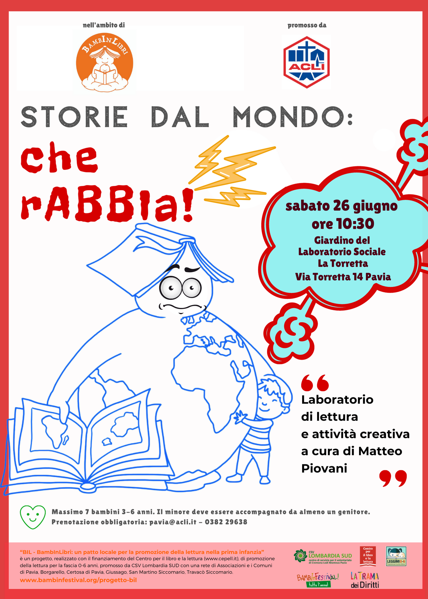 Sabato 26 giugno ore 10:30 Giardino del Laboratorio Sociale La Torretta, Via Torretta 14 Pavia. Massimo 7 bambini 3-6 anni. Il minore deve essere accompagnato da almeno un genitore. Prenotazione obbligatoria: [email protected] – 0382 29638 | Manifesto Manifesto (159 download )