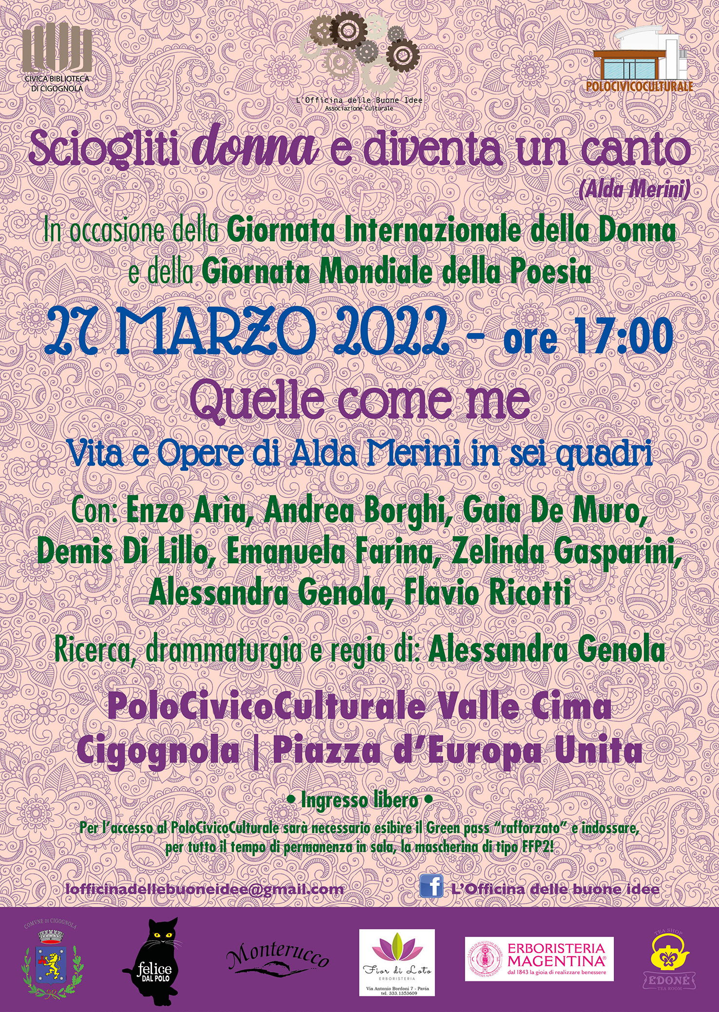 Domenica 27 marzo 2022, alle ore 17:00, si terrà presso il Polo Civico Culturale di Cigognola (Piazza d’Europa Unita, Valle Cima, Cigognola) l’iniziativa “Quelle come me: Vita e opere di Alda Merini in sei quadri“, quarto appuntamento tra gli eventi organizzati da L’Officina delle Buone Idee in occasione della Giornata Internazionale della Donna e la Giornata Mondiale della Poesia.