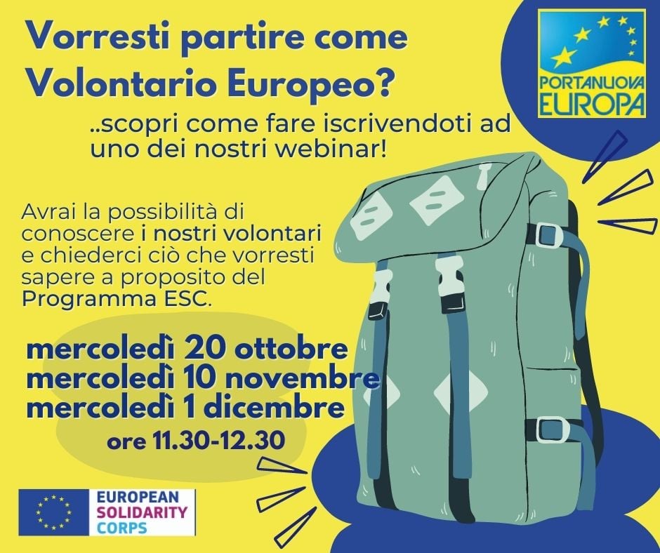 Mercoledì 10 novembre e mercoledì 1 dicembre 2021, dalle 11.30 alle 12.30, si terranno due webinar gratuiti di presentazione del Programma di Volontariato Europeo, organizzati da Porta Nuova Europa.