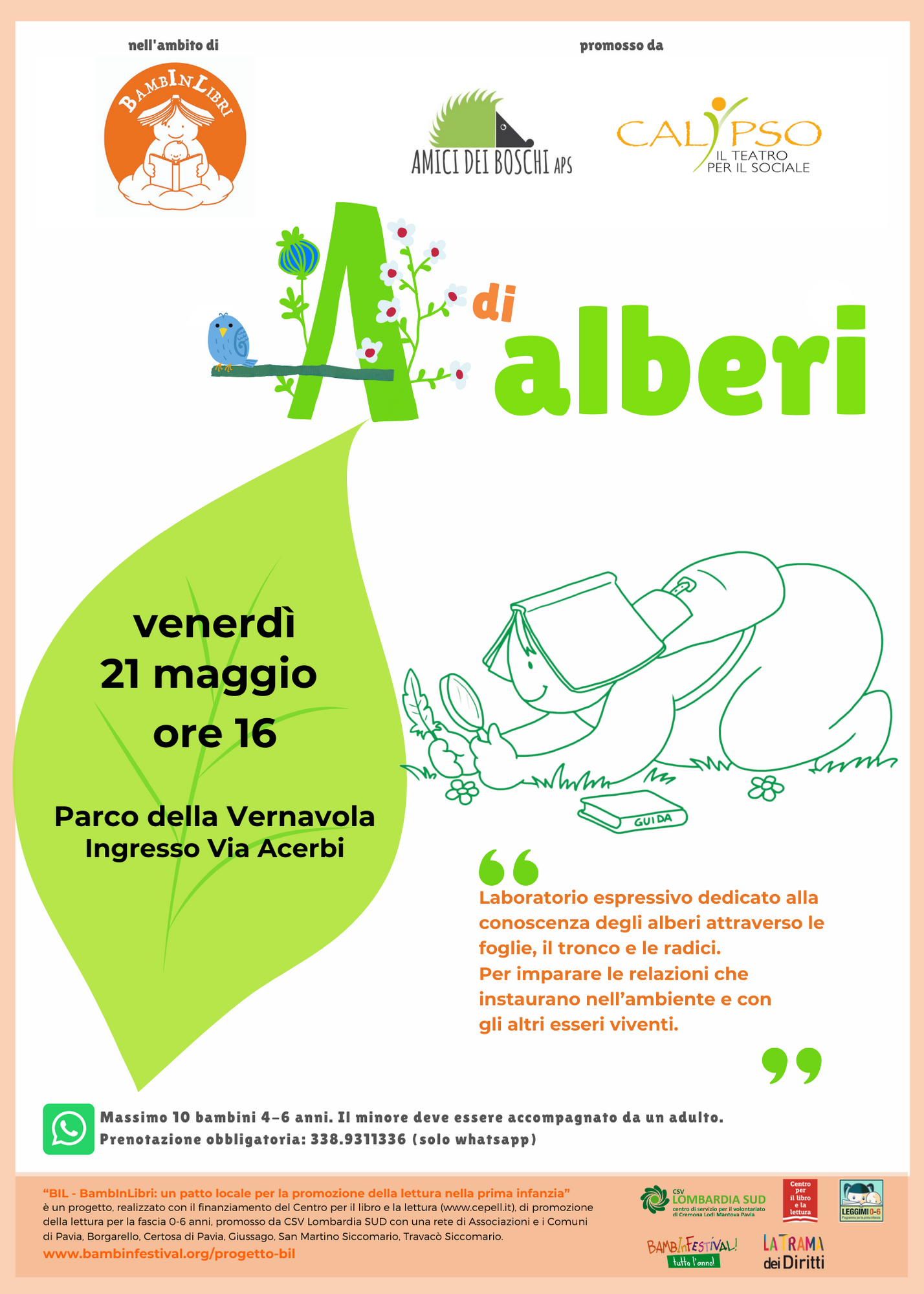 Venerdì 21 maggio alle ore 16 con il laboratorio A di Alberi, durante il quale una naturalista e un narratore dell’Associazione Amici dei Boschi e di Calypso inviteranno a scoprire come vivono gli alberi e come sviluppano relazioni, nella verde cornice del parco della Vernavola, con ingresso da via Acerbi. Ci sono ancora pochi posti disponibili per bambini fra i 4 e i 6 anni, accompagnati da un adulto. manifesto (280 download )