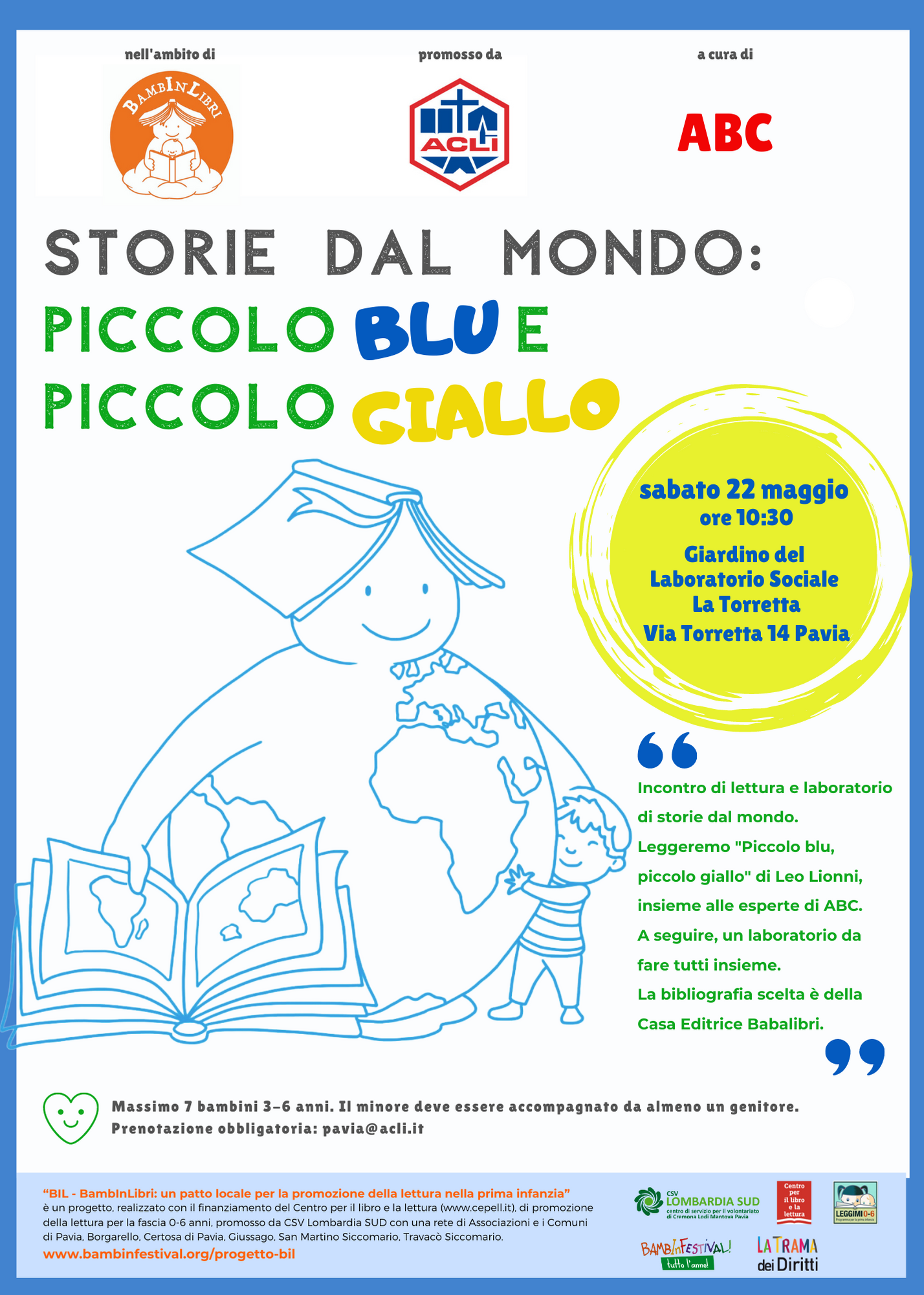 Sabato 22 maggio alle 10:30, nel giardino del Laboratorio Sociale La Torretta le animatrici di ABC animeranno Piccolo blu piccolo giallo, cui farà seguito un laboratorio creativo. L’attività è rivolta a 7 bambini dai 3 ai 6 anni, accompagnati da un adulto. Manifesto (248 download )