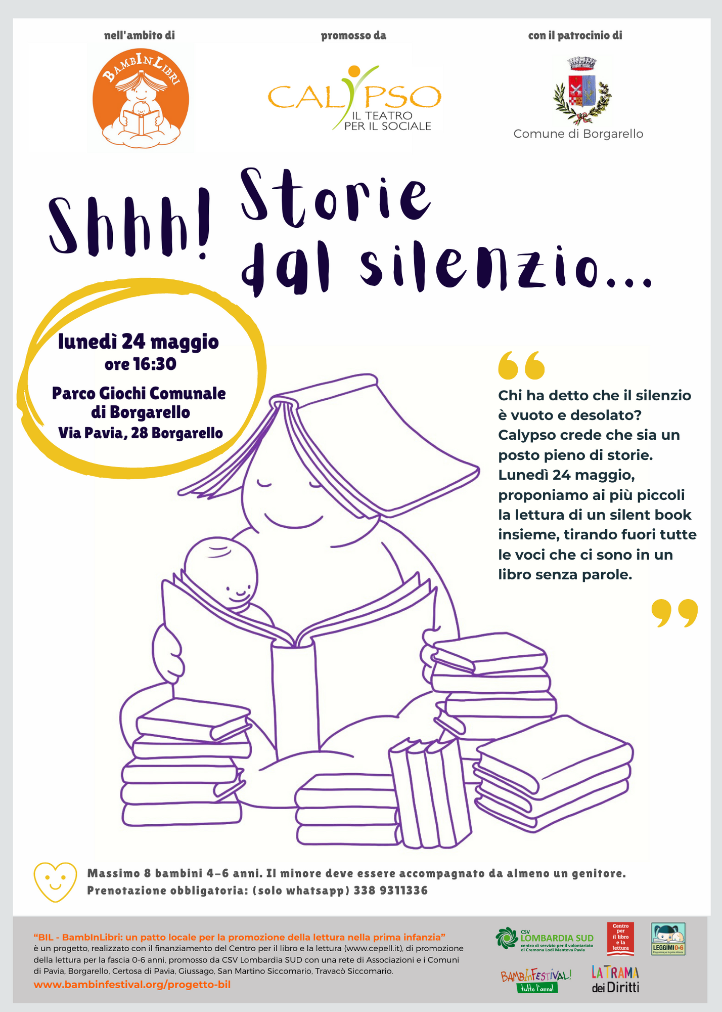 Infine, lunedì 24 maggio alle 16:30, al parco comunale di Borgarello, via Pavia 28, Calypso proporrà una Lettura dal silenzio, in cui verrà proposto a 8 bambini dai 4 ai 6 anni la lettura di un silent book insieme. Seguirà un’animazione. Manifesto (257 download )